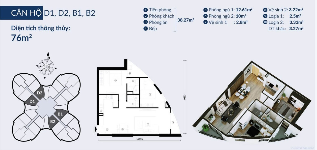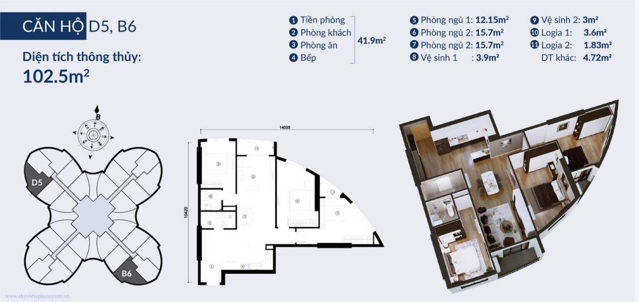 Diện tích căn hộ: 72 – 102 m²; Penthouse từ 300 m²