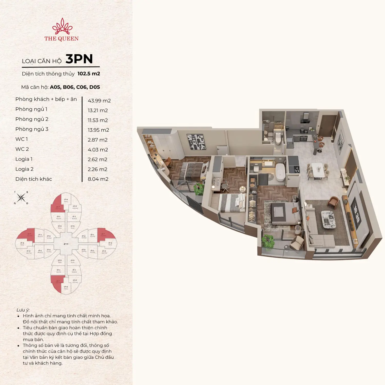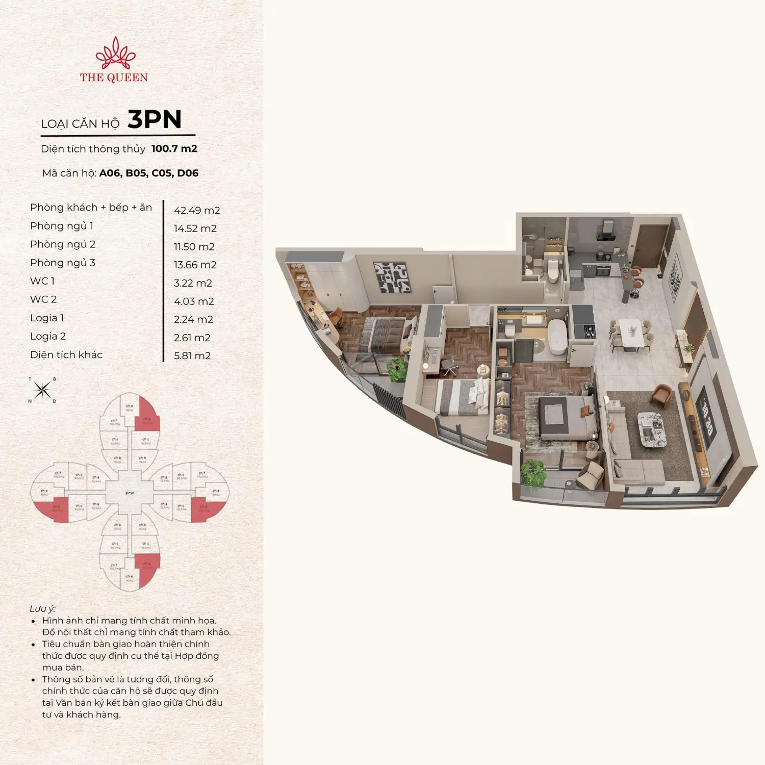 Mặt bằng Dự án The Queen có mặt bằng thiết kế hình cánh hoa sen với 4 cánh vươn đều, tạo cảm giác mềm mại, uyển chuyển. Mỗi tầng có từ 8–10 căn hộ, hành lang rộng thoáng, tối ưu sự riêng tư và lưu thông không khí.